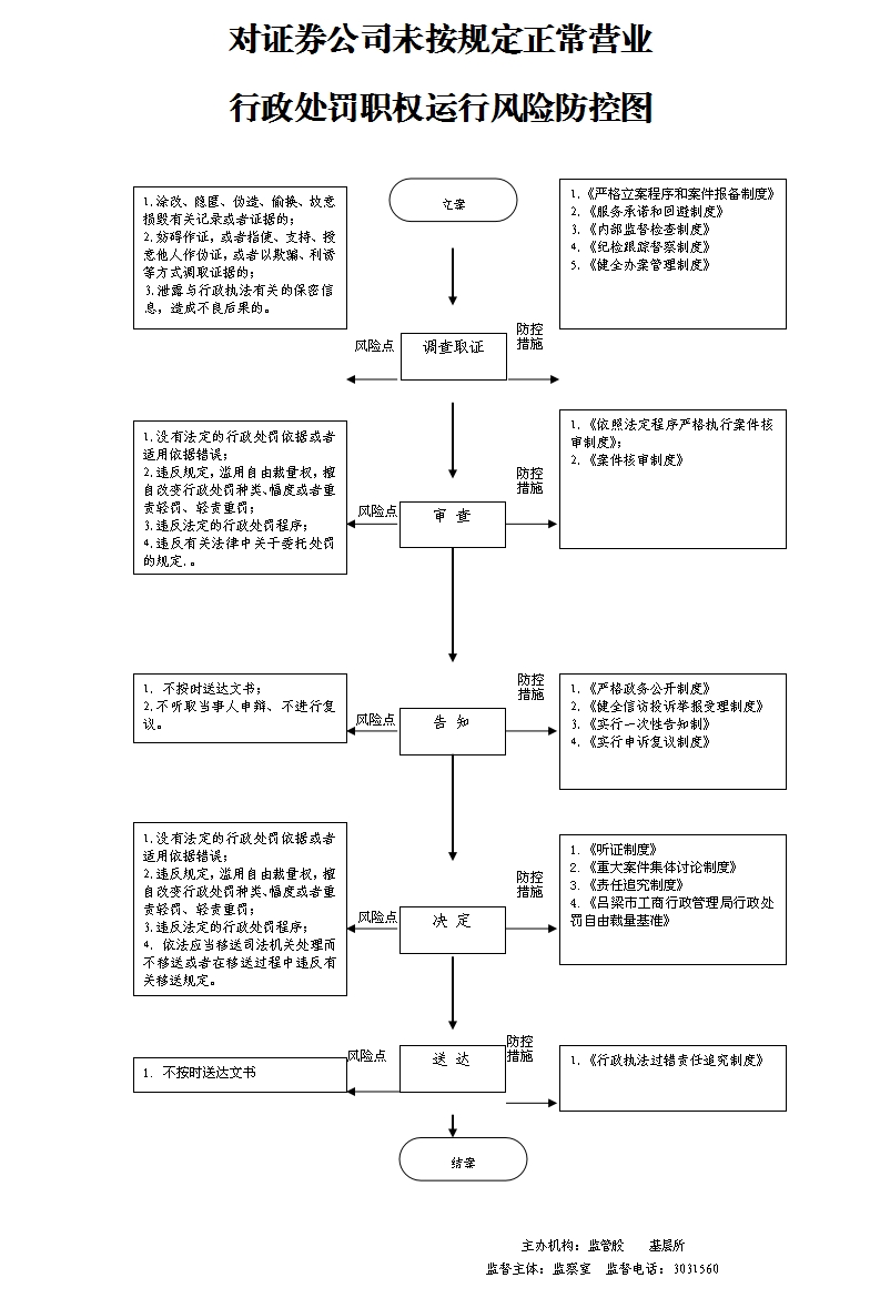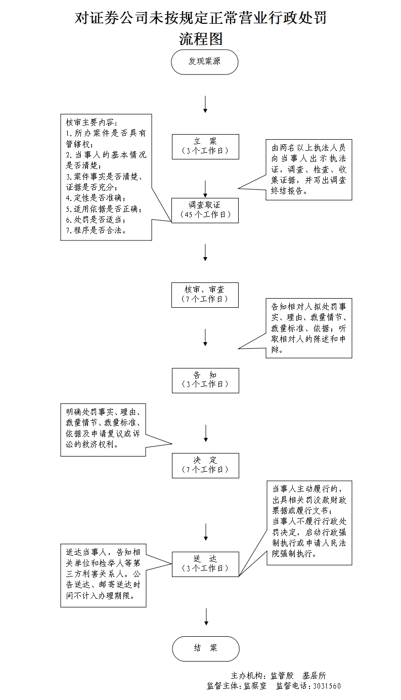 (一)立案责任: 1、工商行政管理机关依据监督检查职权,或者通过投诉、申诉、举报、其他机关移送、上级机关交办等途径发现、查处违法行为。 2、应当自收到材料之日起七个工作日内予以核查,并决定是否立案;特殊情况下,可以延长至十五个工作日内决定是否立案。 (二)调查取证责任: 1、立案后,办案人员应当及时进行调查,收集、调取证据,并可以依照法律、法规的规定进行检查。 2、首次向案件当事人收集、调取证据的,应当告知其有申请办案人员回避的权利。 3、向有关单位和个人收集、调取证据时,应当告知其有如实提供证据的义务。 4、在调查或者进行检查时,执法人员不得少于两人,并应当向当事人或者有关人员出示证件。询问或者检查应当制作笔录。 5、案件调查终结,或者办案机构认为应当终止调查的,按照下列方式处理:(1)认为违法事实成立,应当予以行政处罚的,写出调查终结报告,草拟行政处罚建议书,连同案卷交由核审机构核审。(2)认为违法事实不成立,应当予以销案的;或者违法行为轻微,没有造成危害后果,不予行政处罚的;或者案件不属于本机关管辖应当移交其他行政机关管辖的;或者涉嫌犯罪,应当移送司法机关的,写出调查终结报告,说明拟作处理的理由,报工商行政管理机关负责人批准后根据不同情况分别处理。 (三)审查责任: 1、核审机构接到办案机构的核审材料后,应当予以登记,并指定具体承办人员负责核审工作; 2、核审机构经过对案件进行核审,提出书面意见和建议; 3、核审机构核审完毕,应当及时退卷; (四)告知责任: 1、工商行政管理机关负责人对行政处罚建议批准后,由办案机构以办案机关的名义,告知当事人拟作出行政处罚的事实、理由、依据、处罚内容,并告知当事人依法享有陈述、申辩权。 2、凡拟作出的行政处罚属于听证范围的,应当告知当事人有要求举行听证的权利。 (五)决定责任: 1、工商行政管理机关负责人经对案件调查终结报告、核审意见或者听证报告,当事人的陈述、申辩意见,拟作出的行政处罚决定进行审查,根据不同情况分别作出给予行政处罚、销案、不予行政处罚、移送其他机关等处理决定; 2、已作出行政处罚决定的案件,涉嫌犯罪的,工商行政管理机关应当依相关规定及时移送司法机关。 (六)送达责任: 1、工商行政管理机关送达处罚决定书,应当在宣告后当场交付当事人; 2、当事人不在场的,应当在七日内按照法定其他形式送达。 (七)其他 其他法律法规规章文件规定应履行的责任。 |