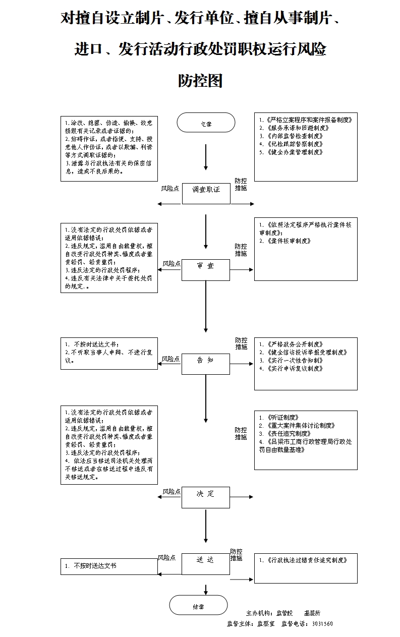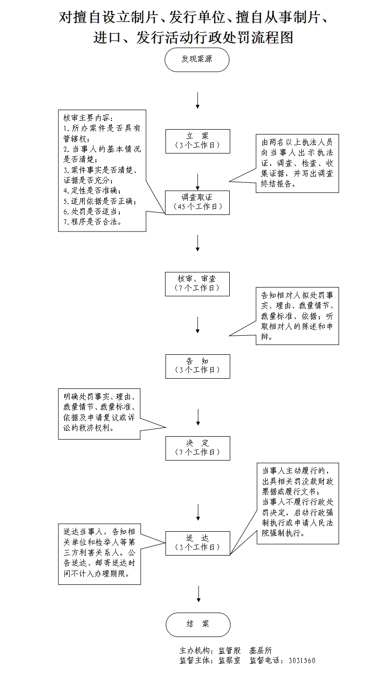 (一)立案责任: 1、工商行政管理机关依据监督检查职权,或者通过投诉、申诉、举报、其他机关移送、上级机关交办等途径发现、查处违法行为。 2、应当自收到材料之日起七个工作日内予以核查,并决定是否立案;特殊情况下,可以延长至十五个工作日内决定是否立案。 (二)调查取证责任: 1、立案后,办案人员应当及时进行调查,收集、调取证据,并可以依照法律、法规的规定进行检查。 2、首次向案件当事人收集、调取证据的,应当告知其有申请办案人员回避的权利。 3、向有关单位和个人收集、调取证据时,应当告知其有如实提供证据的义务。 4、在调查或者进行检查时,执法人员不得少于两人,并应当向当事人或者有关人员出示证件。询问或者检查应当制作笔录。 5、案件调查终结,或者办案机构认为应当终止调查的,按照下列方式处理:(1)认为违法事实成立,应当予以行政处罚的,写出调查终结报告,草拟行政处罚建议书,连同案卷交由核审机构核审。(2)认为违法事实不成立,应当予以销案的;或者违法行为轻微,没有造成危害后果,不予行政处罚的;或者案件不属于本机关管辖应当移交其他行政机关管辖的;或者涉嫌犯罪,应当移送司法机关的,写出调查终结报告,说明拟作处理的理由,报工商行政管理机关负责人批准后根据不同情况分别处理。 (三)审查责任: 1、核审机构接到办案机构的核审材料后,应当予以登记,并指定具体承办人员负责核审工作; 2、核审机构经过对案件进行核审,提出书面意见和建议; 3、核审机构核审完毕,应当及时退卷; (四)告知责任: 1、工商行政管理机关负责人对行政处罚建议批准后,由办案机构以办案机关的名义,告知当事人拟作出行政处罚的事实、理由、依据、处罚内容,并告知当事人依法享有陈述、申辩权。 2、凡拟作出的行政处罚属于听证范围的,应当告知当事人有要求举行听证的权利。 (五)决定责任: 1、工商行政管理机关负责人经对案件调查终结报告、核审意见或者听证报告,当事人的陈述、申辩意见,拟作出的行政处罚决定进行审查,根据不同情况分别作出给予行政处罚、销案、不予行政处罚、移送其他机关等处理决定; 2、已作出行政处罚决定的案件,涉嫌犯罪的,工商行政管理机关应当依相关规定及时移送司法机关。 (六)送达责任: 1、工商行政管理机关送达处罚决定书,应当在宣告后当场交付当事人; 2、当事人不在场的,应当在七日内按照法定其他形式送达。 (七)其他 其他法律法规规章文件规定应履行的责任。 |