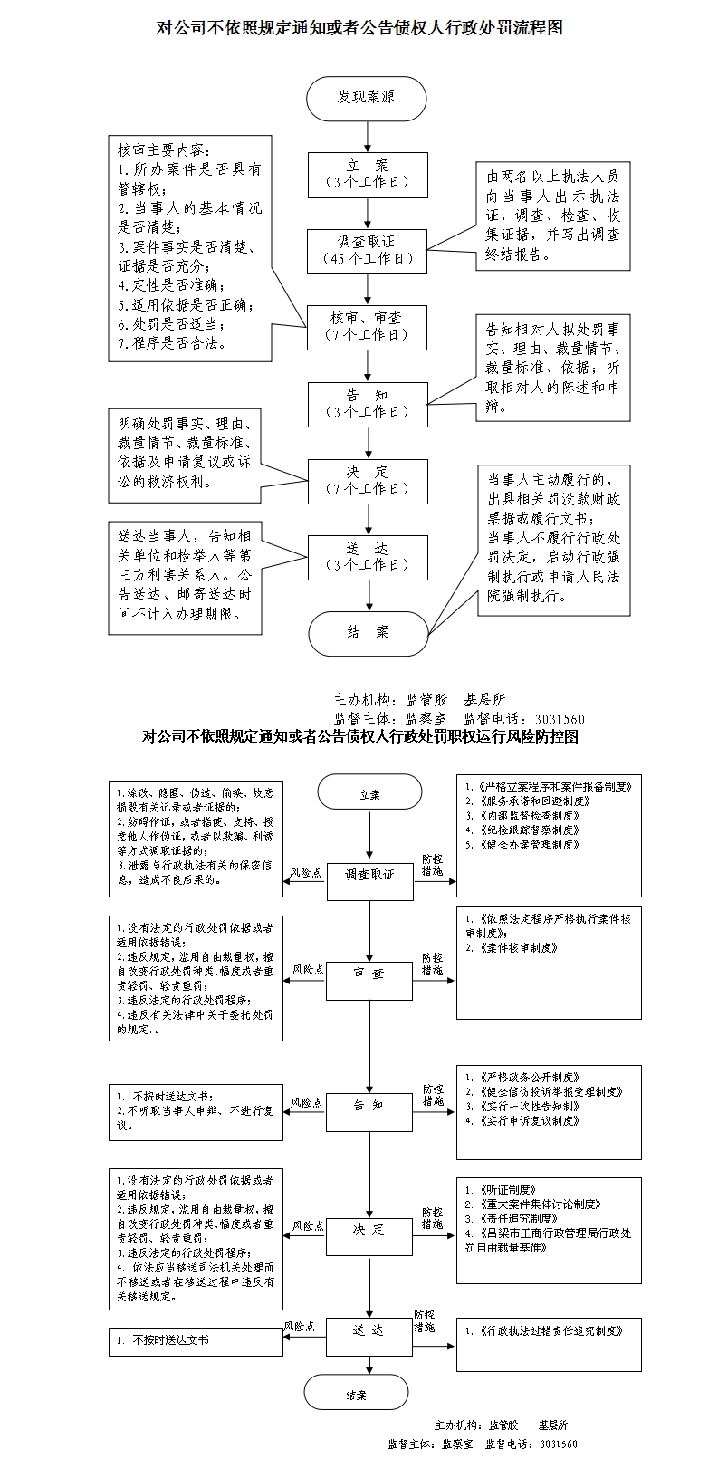 (一)立案责任: 1、工商行政管理机关依据监督检查职权,或者通过投诉、申诉、举报、其他机关移送、上级机关交办等途径发现、查处违法行为。 2、应当自收到材料之日起七个工作日内予以核查,并决定是否立案;特殊情况下,可以延长至十五个工作日内决定是否立案。 (二)调查取证责任: 1、立案后,办案人员应当及时进行调查,收集、调取证据,并可以依照法律、法规的规定进行检查。 2、首次向案件当事人收集、调取证据的,应当告知其有申请办案人员回避的权利。 3、向有关单位和个人收集、调取证据时,应当告知其有如实提供证据的义务。 4、在调查或者进行检查时,执法人员不得少于两人,并应当向当事人或者有关人员出示证件。询问或者检查应当制作笔录。 5、案件调查终结,或者办案机构认为应当终止调查的,按照下列方式处理:(1)认为违法事实成立,应当予以行政处罚的,写出调查终结报告,草拟行政处罚建议书,连同案卷交由核审机构核审。(2)认为违法事实不成立,应当予以销案的;或者违法行为轻微,没有造成危害后果,不予行政处罚的;或者案件不属于本机关管辖应当移交其他行政机关管辖的;或者涉嫌犯罪,应当移送司法机关的,写出调查终结报告,说明拟作处理的理由,报工商行政管理机关负责人批准后根据不同情况分别处理。 (三)审查责任: 1、核审机构接到办案机构的核审材料后,应当予以登记,并指定具体承办人员负责核审工作; 2、核审机构经过对案件进行核审,提出书面意见和建议; 3、核审机构核审完毕,应当及时退卷; (四)告知责任: 1、工商行政管理机关负责人对行政处罚建议批准后,由办案机构以办案机关的名义,告知当事人拟作出行政处罚的事实、理由、依据、处罚内容,并告知当事人依法享有陈述、申辩权。 2、凡拟作出的行政处罚属于听证范围的,应当告知当事人有要求举行听证的权利。 (五)决定责任: 1、工商行政管理机关负责人经对案件调查终结报告、核审意见或者听证报告,当事人的陈述、申辩意见,拟作出的行政处罚决定进行审查,根据不同情况分别作出给予行政处罚、销案、不予行政处罚、移送其他机关等处理决定; 2、已作出行政处罚决定的案件,涉嫌犯罪的,工商行政管理机关应当依相关规定及时移送司法机关。 (六)送达责任: 1、工商行政管理机关送达处罚决定书,应当在宣告后当场交付当事人; 2、当事人不在场的,应当在七日内按照法定其他形式送达。 (七)其他 其他法律法规规章文件规定应履行的责任。 |