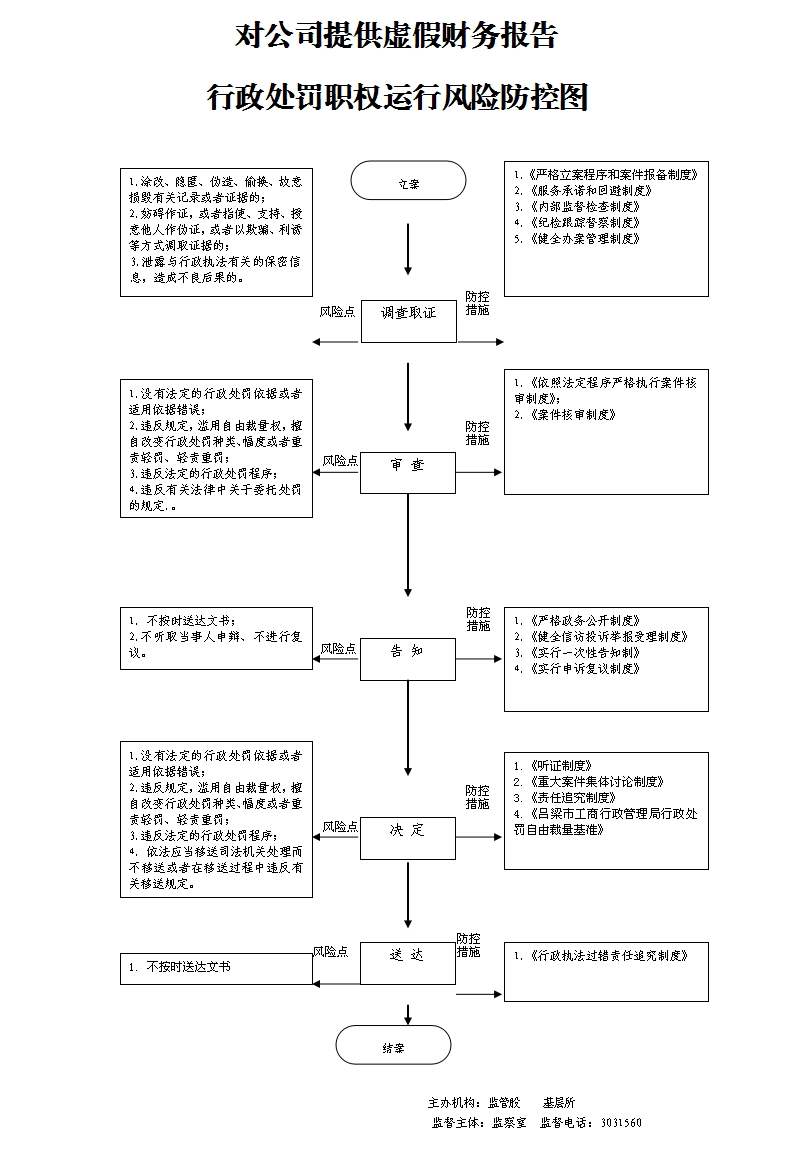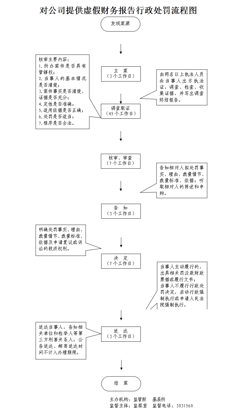 (一)立案责任: 1、工商行政管理机关依据监督检查职权,或者通过投诉、申诉、举报、其他机关移送、上级机关交办等途径发现、查处违法行为。 2、应当自收到材料之日起七个工作日内予以核查,并决定是否立案;特殊情况下,可以延长至十五个工作日内决定是否立案。 (二)调查取证责任: 1、立案后,办案人员应当及时进行调查,收集、调取证据,并可以依照法律、法规的规定进行检查。 2、首次向案件当事人收集、调取证据的,应当告知其有申请办案人员回避的权利。 3、向有关单位和个人收集、调取证据时,应当告知其有如实提供证据的义务。 4、在调查或者进行检查时,执法人员不得少于两人,并应当向当事人或者有关人员出示证件。询问或者检查应当制作笔录。 5、案件调查终结,或者办案机构认为应当终止调查的,按照下列方式处理:(1)认为违法事实成立,应当予以行政处罚的,写出调查终结报告,草拟行政处罚建议书,连同案卷交由核审机构核审。(2)认为违法事实不成立,应当予以销案的;或者违法行为轻微,没有造成危害后果,不予行政处罚的;或者案件不属于本机关管辖应当移交其他行政机关管辖的;或者涉嫌犯罪,应当移送司法机关的,写出调查终结报告,说明拟作处理的理由,报工商行政管理机关负责人批准后根据不同情况分别处理。 (三)审查责任: 1、核审机构接到办案机构的核审材料后,应当予以登记,并指定具体承办人员负责核审工作; 2、核审机构经过对案件进行核审,提出书面意见和建议; 3、核审机构核审完毕,应当及时退卷; (四)告知责任: 1、工商行政管理机关负责人对行政处罚建议批准后,由办案机构以办案机关的名义,告知当事人拟作出行政处罚的事实、理由、依据、处罚内容,并告知当事人依法享有陈述、申辩权。 2、凡拟作出的行政处罚属于听证范围的,应当告知当事人有要求举行听证的权利。 (五)决定责任: 1、工商行政管理机关负责人经对案件调查终结报告、核审意见或者听证报告,当事人的陈述、申辩意见,拟作出的行政处罚决定进行审查,根据不同情况分别作出给予行政处罚、销案、不予行政处罚、移送其他机关等处理决定; 2、已作出行政处罚决定的案件,涉嫌犯罪的,工商行政管理机关应当依相关规定及时移送司法机关。 (六)送达责任: 1、工商行政管理机关送达处罚决定书,应当在宣告后当场交付当事人; 2、当事人不在场的,应当在七日内按照法定其他形式送达。 (七)其他 其他法律法规规章文件规定应履行的责任。 |
