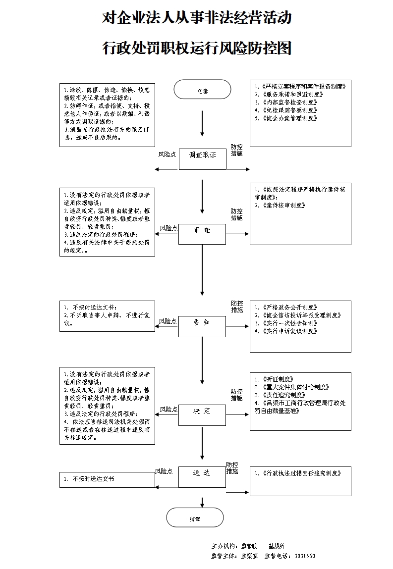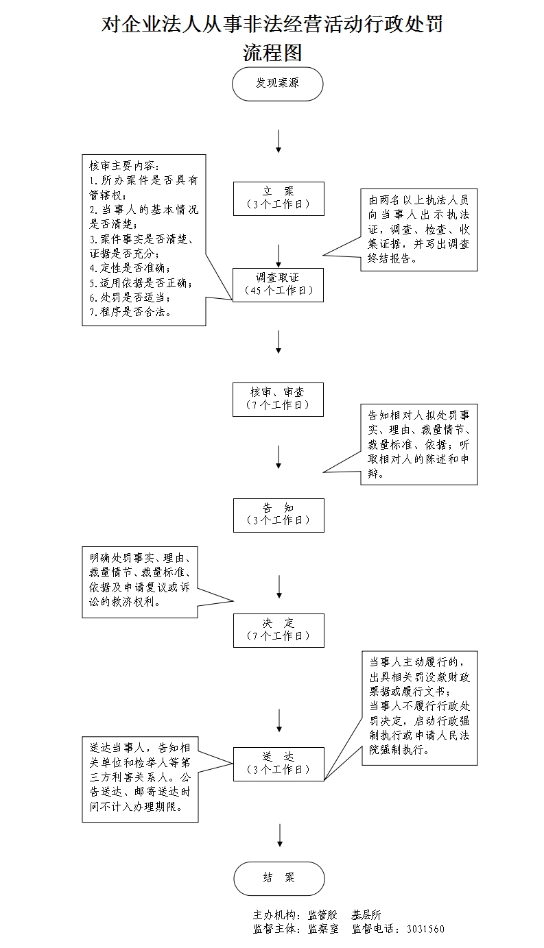 (一)立案责任: 1、工商行政管理机关依据监督检查职权,或者通过投诉、申诉、举报、其他机关移送、上级机关交办等途径发现、查处违法行为。 2、应当自收到材料之日起七个工作日内予以核查,并决定是否立案;特殊情况下,可以延长至十五个工作日内决定是否立案。 (二)调查取证责任: 1、立案后,办案人员应当及时进行调查,收集、调取证据,并可以依照法律、法规的规定进行检查。 2、首次向案件当事人收集、调取证据的,应当告知其有申请办案人员回避的权利。 3、向有关单位和个人收集、调取证据时,应当告知其有如实提供证据的义务。 4、在调查或者进行检查时,执法人员不得少于两人,并应当向当事人或者有关人员出示证件。询问或者检查应当制作笔录。 5、案件调查终结,或者办案机构认为应当终止调查的,按照下列方式处理:(1)认为违法事实成立,应当予以行政处罚的,写出调查终结报告,草拟行政处罚建议书,连同案卷交由核审机构核审。(2)认为违法事实不成立,应当予以销案的;或者违法行为轻微,没有造成危害后果,不予行政处罚的;或者案件不属于本机关管辖应当移交其他行政机关管辖的;或者涉嫌犯罪,应当移送司法机关的,写出调查终结报告,说明拟作处理的理由,报工商行政管理机关负责人批准后根据不同情况分别处理。 (三)审查责任: 1、核审机构接到办案机构的核审材料后,应当予以登记,并指定具体承办人员负责核审工作; 2、核审机构经过对案件进行核审,提出书面意见和建议; 3、核审机构核审完毕,应当及时退卷; (四)告知责任: 1、工商行政管理机关负责人对行政处罚建议批准后,由办案机构以办案机关的名义,告知当事人拟作出行政处罚的事实、理由、依据、处罚内容,并告知当事人依法享有陈述、申辩权。 2、凡拟作出的行政处罚属于听证范围的,应当告知当事人有要求举行听证的权利。 (五)决定责任: 1、工商行政管理机关负责人经对案件调查终结报告、核审意见或者听证报告,当事人的陈述、申辩意见,拟作出的行政处罚决定进行审查,根据不同情况分别作出给予行政处罚、销案、不予行政处罚、移送其他机关等处理决定; 2、已作出行政处罚决定的案件,涉嫌犯罪的,工商行政管理机关应当依相关规定及时移送司法机关。 (六)送达责任: 1、工商行政管理机关送达处罚决定书,应当在宣告后当场交付当事人; 2、当事人不在场的,应当在七日内按照法定其他形式送达。 (七)其他 其他法律法规规章文件规定应履行的责任。 |