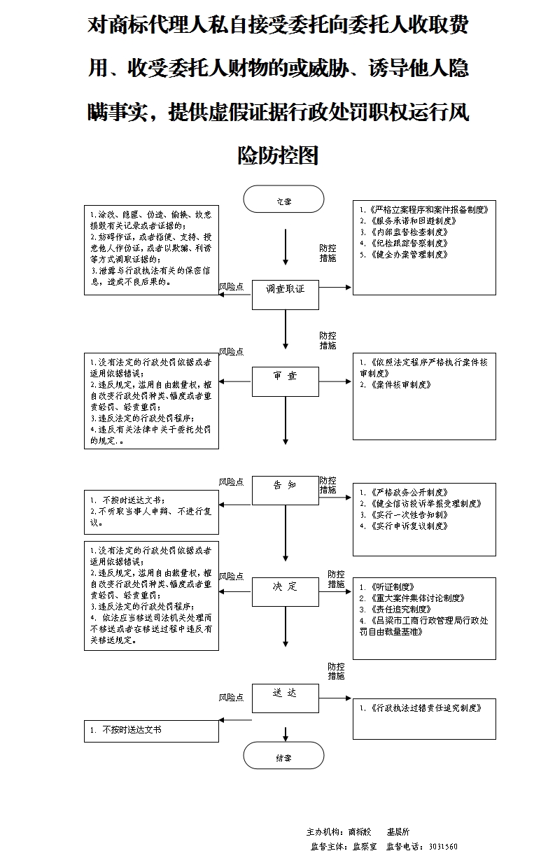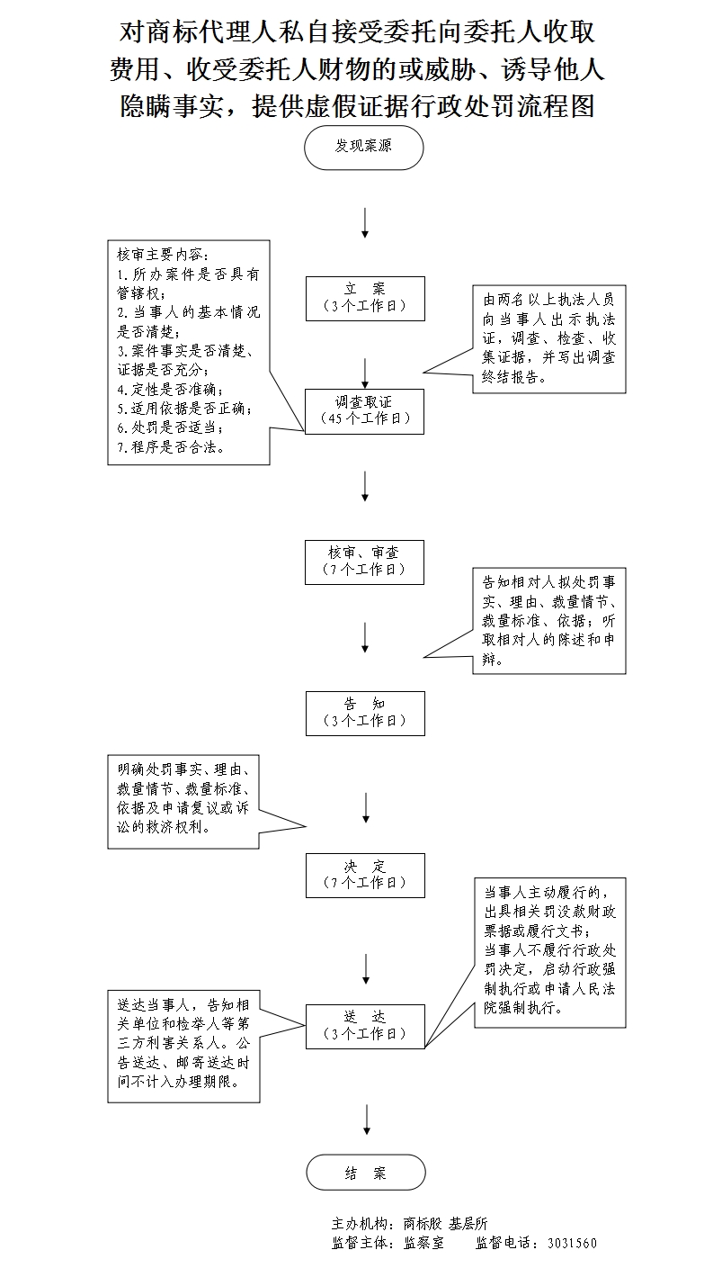 (一)立案责任: 1、工商行政管理机关依据监督检查职权,或者通过投诉、申诉、举报、其他机关移送、上级机关交办等途径发现、查处违法行为。 2、应当自收到材料之日起七个工作日内予以核查,并决定是否立案;特殊情况下,可以延长至十五个工作日内决定是否立案。 (二)调查取证责任: 1、立案后,办案人员应当及时进行调查,收集、调取证据,并可以依照法律、法规的规定进行检查。 2、首次向案件当事人收集、调取证据的,应当告知其有申请办案人员回避的权利。 3、向有关单位和个人收集、调取证据时,应当告知其有如实提供证据的义务。 4、在调查或者进行检查时,执法人员不得少于两人,并应当向当事人或者有关人员出示证件。询问或者检查应当制作笔录。 5、案件调查终结,或者办案机构认为应当终止调查的,按照下列方式处理:(1)认为违法事实成立,应当予以行政处罚的,写出调查终结报告,草拟行政处罚建议书,连同案卷交由核审机构核审。(2)认为违法事实不成立,应当予以销案的;或者违法行为轻微,没有造成危害后果,不予行政处罚的;或者案件不属于本机关管辖应当移交其他行政机关管辖的;或者涉嫌犯罪,应当移送司法机关的,写出调查终结报告,说明拟作处理的理由,报工商行政管理机关负责人批准后根据不同情况分别处理。 (三)审查责任: 1、核审机构接到办案机构的核审材料后,应当予以登记,并指定具体承办人员负责核审工作; 2、核审机构经过对案件进行核审,提出书面意见和建议; 3、核审机构核审完毕,应当及时退卷; (四)告知责任: 1、工商行政管理机关负责人对行政处罚建议批准后,由办案机构以办案机关的名义,告知当事人拟作出行政处罚的事实、理由、依据、处罚内容,并告知当事人依法享有陈述、申辩权。 2、凡拟作出的行政处罚属于听证范围的,应当告知当事人有要求举行听证的权利。 (五)决定责任: 1、工商行政管理机关负责人经对案件调查终结报告、核审意见或者听证报告,当事人的陈述、申辩意见,拟作出的行政处罚决定进行审查,根据不同情况分别作出给予行政处罚、销案、不予行政处罚、移送其他机关等处理决定; 2、已作出行政处罚决定的案件,涉嫌犯罪的,工商行政管理机关应当依相关规定及时移送司法机关。 (六)送达责任: 1、工商行政管理机关送达处罚决定书,应当在宣告后当场交付当事人; 2、当事人不在场的,应当在七日内按照法定其他形式送达。 (七)其他 其他法律法规规章文件规定应履行的责任。 |