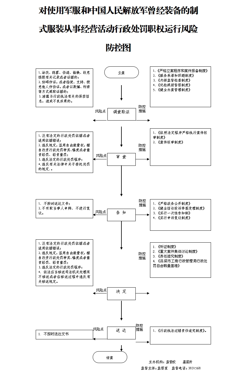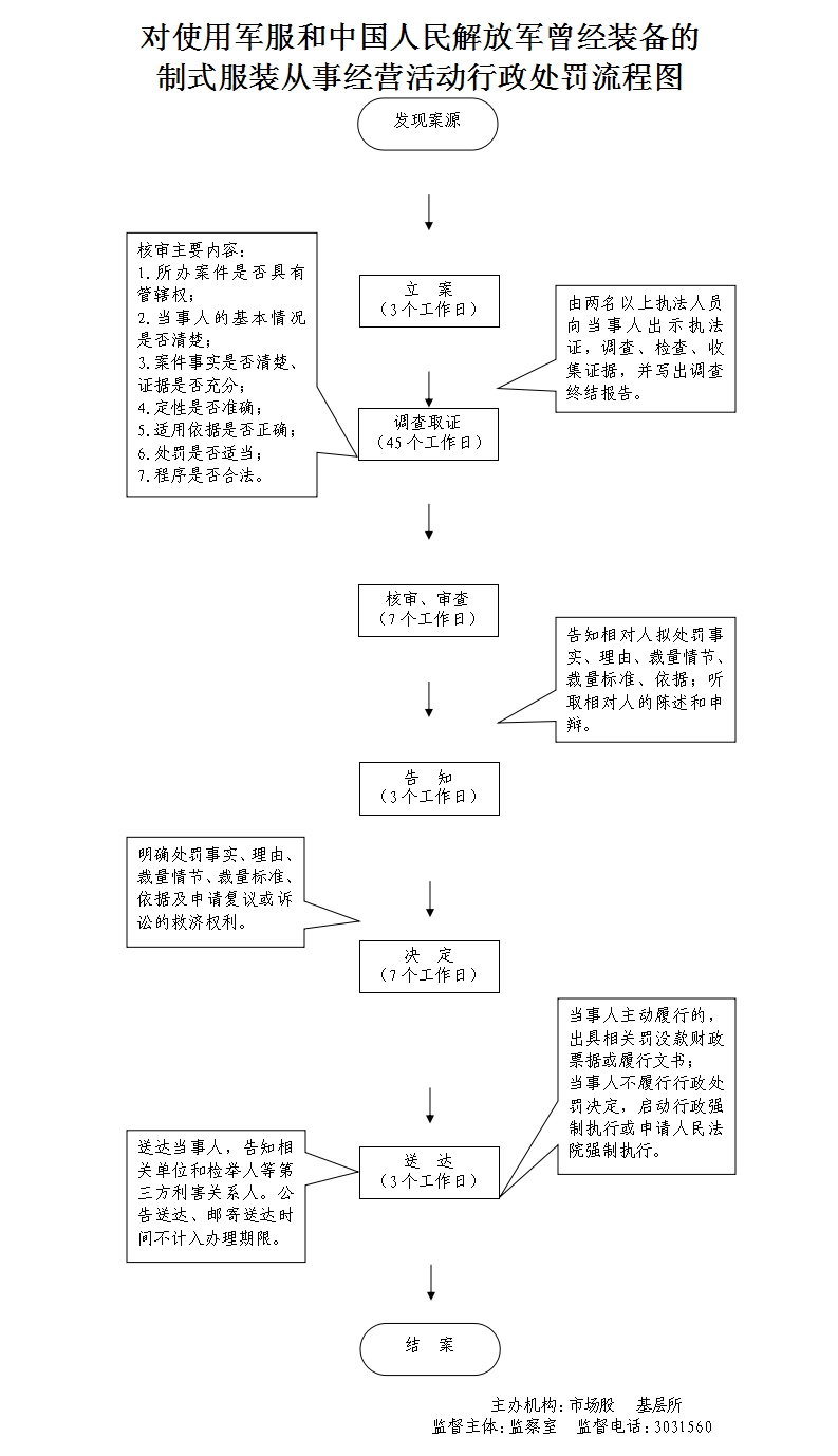 (一)立案责任: 1、工商行政管理机关依据监督检查职权,或者通过投诉、申诉、举报、其他机关移送、上级机关交办等途径发现、查处违法行为。 2、应当自收到材料之日起七个工作日内予以核查,并决定是否立案;特殊情况下,可以延长至十五个工作日内决定是否立案。 (二)调查取证责任: 1、立案后,办案人员应当及时进行调查,收集、调取证据,并可以依照法律、法规的规定进行检查。 2、首次向案件当事人收集、调取证据的,应当告知其有申请办案人员回避的权利。 3、向有关单位和个人收集、调取证据时,应当告知其有如实提供证据的义务。 4、在调查或者进行检查时,执法人员不得少于两人,并应当向当事人或者有关人员出示证件。询问或者检查应当制作笔录。 5、案件调查终结,或者办案机构认为应当终止调查的,按照下列方式处理:(1)认为违法事实成立,应当予以行政处罚的,写出调查终结报告,草拟行政处罚建议书,连同案卷交由核审机构核审。(2)认为违法事实不成立,应当予以销案的;或者违法行为轻微,没有造成危害后果,不予行政处罚的;或者案件不属于本机关管辖应当移交其他行政机关管辖的;或者涉嫌犯罪,应当移送司法机关的,写出调查终结报告,说明拟作处理的理由,报工商行政管理机关负责人批准后根据不同情况分别处理。 (三)审查责任: 1、核审机构接到办案机构的核审材料后,应当予以登记,并指定具体承办人员负责核审工作; 2、核审机构经过对案件进行核审,提出书面意见和建议; 3、核审机构核审完毕,应当及时退卷; (四)告知责任: 1、工商行政管理机关负责人对行政处罚建议批准后,由办案机构以办案机关的名义,告知当事人拟作出行政处罚的事实、理由、依据、处罚内容,并告知当事人依法享有陈述、申辩权。 2、凡拟作出的行政处罚属于听证范围的,应当告知当事人有要求举行听证的权利。 (五)决定责任: 1、工商行政管理机关负责人经对案件调查终结报告、核审意见或者听证报告,当事人的陈述、申辩意见,拟作出的行政处罚决定进行审查,根据不同情况分别作出给予行政处罚、销案、不予行政处罚、移送其他机关等处理决定; 2、已作出行政处罚决定的案件,涉嫌犯罪的,工商行政管理机关应当依相关规定及时移送司法机关。 (六)送达责任: 1、工商行政管理机关送达处罚决定书,应当在宣告后当场交付当事人; 2、当事人不在场的,应当在七日内按照法定其他形式送达。 (七)其他 其他法律法规规章文件规定应履行的责任。 |