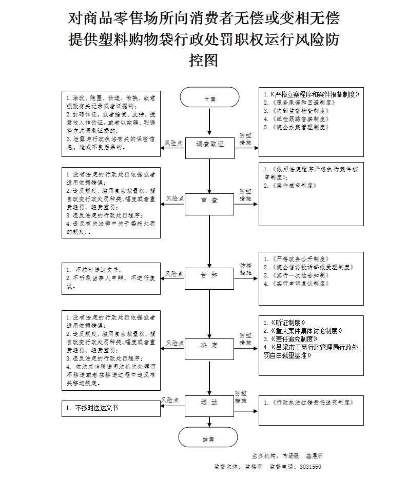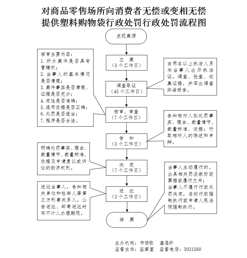 (一)立案责任: 1、工商行政管理机关依据监督检查职权,或者通过投诉、申诉、举报、其他机关移送、上级机关交办等途径发现、查处违法行为。 2、应当自收到材料之日起七个工作日内予以核查,并决定是否立案;特殊情况下,可以延长至十五个工作日内决定是否立案。 (二)调查取证责任: 1、立案后,办案人员应当及时进行调查,收集、调取证据,并可以依照法律、法规的规定进行检查。 2、首次向案件当事人收集、调取证据的,应当告知其有申请办案人员回避的权利。 3、向有关单位和个人收集、调取证据时,应当告知其有如实提供证据的义务。 4、在调查或者进行检查时,执法人员不得少于两人,并应当向当事人或者有关人员出示证件。询问或者检查应当制作笔录。 5、案件调查终结,或者办案机构认为应当终止调查的,按照下列方式处理:(1)认为违法事实成立,应当予以行政处罚的,写出调查终结报告,草拟行政处罚建议书,连同案卷交由核审机构核审。(2)认为违法事实不成立,应当予以销案的;或者违法行为轻微,没有造成危害后果,不予行政处罚的;或者案件不属于本机关管辖应当移交其他行政机关管辖的;或者涉嫌犯罪,应当移送司法机关的,写出调查终结报告,说明拟作处理的理由,报工商行政管理机关负责人批准后根据不同情况分别处理。 (三)审查责任: 1、核审机构接到办案机构的核审材料后,应当予以登记,并指定具体承办人员负责核审工作; 2、核审机构经过对案件进行核审,提出书面意见和建议; 3、核审机构核审完毕,应当及时退卷; (四)告知责任: 1、工商行政管理机关负责人对行政处罚建议批准后,由办案机构以办案机关的名义,告知当事人拟作出行政处罚的事实、理由、依据、处罚内容,并告知当事人依法享有陈述、申辩权。 2、凡拟作出的行政处罚属于听证范围的,应当告知当事人有要求举行听证的权利。 (五)决定责任: 1、工商行政管理机关负责人经对案件调查终结报告、核审意见或者听证报告,当事人的陈述、申辩意见,拟作出的行政处罚决定进行审查,根据不同情况分别作出给予行政处罚、销案、不予行政处罚、移送其他机关等处理决定; 2、已作出行政处罚决定的案件,涉嫌犯罪的,工商行政管理机关应当依相关规定及时移送司法机关。 (六)送达责任: 1、工商行政管理机关送达处罚决定书,应当在宣告后当场交付当事人; 2、当事人不在场的,应当在七日内按照法定其他形式送达。 (七)其他 其他法律法规规章文件规定应履行的责任。 |