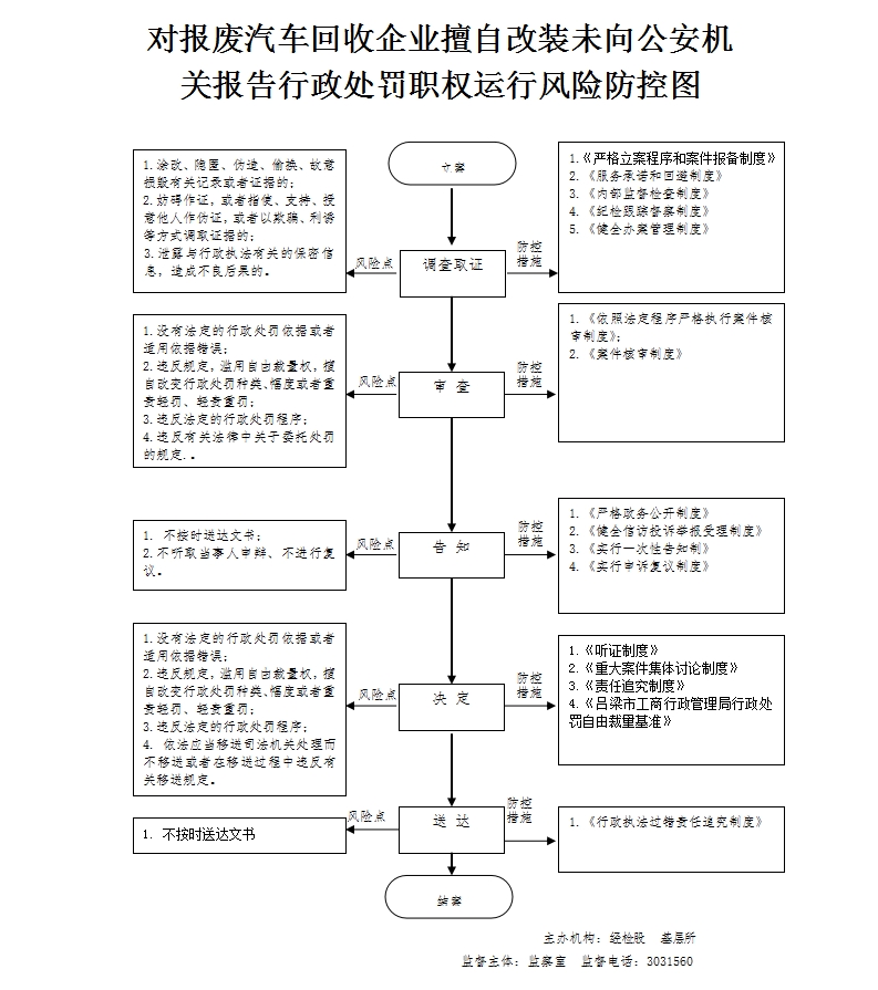 (一)立案责任: 1、工商行政管理机关依据监督检查职权,或者通过投诉、申诉、举报、其他机关移送、上级机关交办等途径发现、查处违法行为。 2、应当自收到材料之日起七个工作日内予以核查,并决定是否立案;特殊情况下,可以延长至十五个工作日内决定是否立案。 (二)调查取证责任: 1、立案后,办案人员应当及时进行调查,收集、调取证据,并可以依照法律、法规的规定进行检查。 2、首次向案件当事人收集、调取证据的,应当告知其有申请办案人员回避的权利。 3、向有关单位和个人收集、调取证据时,应当告知其有如实提供证据的义务。 4、在调查或者进行检查时,执法人员不得少于两人,并应当向当事人或者有关人员出示证件。询问或者检查应当制作笔录。 5、案件调查终结,或者办案机构认为应当终止调查的,按照下列方式处理:(1)认为违法事实成立,应当予以行政处罚的,写出调查终结报告,草拟行政处罚建议书,连同案卷交由核审机构核审。(2)认为违法事实不成立,应当予以销案的;或者违法行为轻微,没有造成危害后果,不予行政处罚的;或者案件不属于本机关管辖应当移交其他行政机关管辖的;或者涉嫌犯罪,应当移送司法机关的,写出调查终结报告,说明拟作处理的理由,报工商行政管理机关负责人批准后根据不同情况分别处理。 (三)审查责任: 1、核审机构接到办案机构的核审材料后,应当予以登记,并指定具体承办人员负责核审工作; 2、核审机构经过对案件进行核审,提出书面意见和建议; 3、核审机构核审完毕,应当及时退卷; (四)告知责任: 1、工商行政管理机关负责人对行政处罚建议批准后,由办案机构以办案机关的名义,告知当事人拟作出行政处罚的事实、理由、依据、处罚内容,并告知当事人依法享有陈述、申辩权。 2、凡拟作出的行政处罚属于听证范围的,应当告知当事人有要求举行听证的权利。 (五)决定责任: 1、工商行政管理机关负责人经对案件调查终结报告、核审意见或者听证报告,当事人的陈述、申辩意见,拟作出的行政处罚决定进行审查,根据不同情况分别作出给予行政处罚、销案、不予行政处罚、移送其他机关等处理决定; 2、已作出行政处罚决定的案件,涉嫌犯罪的,工商行政管理机关应当依相关规定及时移送司法机关。 (六)送达责任: 1、工商行政管理机关送达处罚决定书,应当在宣告后当场交付当事人; 2、当事人不在场的,应当在七日内按照法定其他形式送达。 (七)其他 其他法律法规规章文件规定应履行的责任。 |