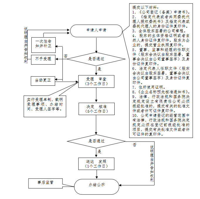 1、受理责任:公示依法应当提交的材料;一次性告知补正材料(含企业名称核准);依法受理或不予受理(不予受理的应当告知理由)。 2、审查责任:依法对公司登记申报材料审核、提出预审意见。 3、决定责任:作出准予或者不予登记的行政许可决定(不予登记的应当告知理由)、法定告知。 4、送达责任:制作并送达公司营业执照,信息公开。 5、事后监管责任:建立实施监督检查的运行机制和管理制度,开展定期和不定期检查,依法采取相关处置措施。 6、其他法律法规规章文件规定应履行的责任。