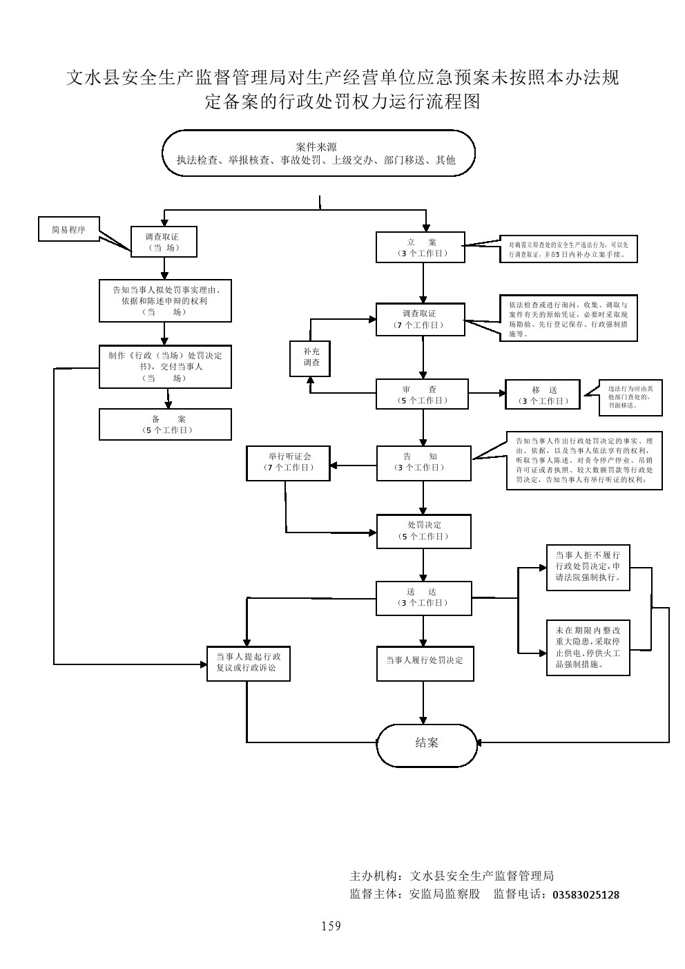 1、立案责任:在检查中或者事故调查过程中发现、或者接到举报、或部门移交的违法案件,予以审查,决定是否立案。 2、调查责任:对已经立案的案件,进行调查时,执法人员不得少于两人,与当事人有直接利害关系的应当回避。调查时应出示执法证件,收集相关证据,允许当事人辩解陈述,执法人员应保守有关秘密。 3、审查责任:对案件违法事实、证据、调查取证程序、法律适用、处罚种类和幅度、当事人陈述和申辩理由等方面进行审查,提出处理意见。 4、告知责任:在做出行政处罚决定前,制作《行政处罚告知书》,符合听证条件的制作《听证告知书》,通知当事人,当事人享有的陈述、申辩、要求听证的权利。 5、决定责任:根据审理情况决定是否予以行政处罚。依法需要给予行政处罚的,制作《行政处罚决定书》,载明违法事实和证据、处罚依据和内容、缴纳罚款的银行、申请行政复议或提起行政诉讼的途径和期限等内容。 6、送达责任:《行政处罚决定书》按照法定的方式和期限送达当事人。 7、执行责任:监督当事人在决定的期限内,履行生效的处罚决定。当事人在法定期限内不申请行政复议或者提起行政诉讼,又不履行的,发出催缴通知,加收罚款滞纳金,再不履行的向人民法院申请强制执行。 |