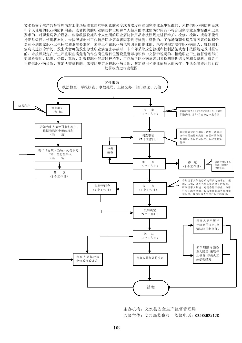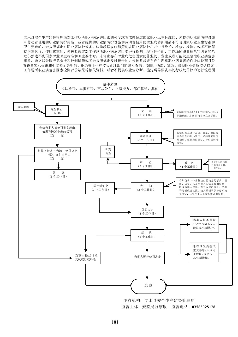 1、立案责任:在检查中或者事故调查过程中发现、或者接到举报、或部门移交的违法案件,予以审查,决定是否立案。 2、调查责任:对已经立案的案件,进行调查时,执法人员不得少于两人,与当事人有直接利害关系的应当回避。调查时应出示执法证件,收集相关证据,允许当事人辩解陈述,执法人员应保守有关秘密。 3、审查责任:对案件违法事实、证据、调查取证程序、法律适用、处罚种类和幅度、当事人陈述和申辩理由等方面进行审查,提出处理意见。 4、告知责任:在做出行政处罚决定前,制作《行政处罚告知书》,符合听证条件的制作《听证告知书》,通知当事人,当事人享有的陈述、申辩、要求听证的权利。 5、决定责任:根据审理情况决定是否予以行政处罚。依法需要给予行政处罚的,制作《行政处罚决定书》,载明违法事实和证据、处罚依据和内容、缴纳罚款的银行、申请行政复议或提起行政诉讼的途径和期限等内容。 6、送达责任:《行政处罚决定书》按照法定的方式和期限送达当事人。 7、执行责任:监督当事人在决定的期限内,履行生效的处罚决定。当事人在法定期限内不申请行政复议或者提起行政诉讼,又不履行的,发出催缴通知,加收罚款滞纳金,再不履行的向人民法院申请强制执行。 |