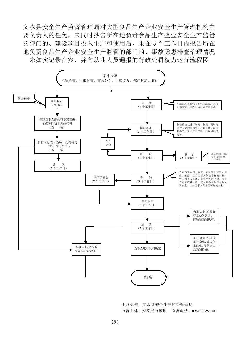 1、立案责任:在检查中或者事故调查过程中发现、或者接到举报、或部门移交的违法案件,予以审查,决定是否立案。 2、调查责任:对已经立案的案件,进行调查时,执法人员不得少于两人,与当事人有直接利害关系的应当回避。调查时应出示执法证件,收集相关证据,允许当事人辩解陈述,执法人员应保守有关秘密。 3、审查责任:对案件违法事实、证据、调查取证程序、法律适用、处罚种类和幅度、当事人陈述和申辩理由等方面进行审查,提出处理意见。 4、告知责任:在做出行政处罚决定前,制作《行政处罚告知书》,符合听证条件的制作《听证告知书》,通知当事人,当事人享有的陈述、申辩、要求听证的权利。 5、决定责任:根据审理情况决定是否予以行政处罚。依法需要给予行政处罚的,制作《行政处罚决定书》,载明违法事实和证据、处罚依据和内容、缴纳罚款的银行、申请行政复议或提起行政诉讼的途径和期限等内容。 6、送达责任:《行政处罚决定书》按照法定的方式和期限送达当事人。 7、执行责任:监督当事人在决定的期限内,履行生效的处罚决定。当事人在法定期限内不申请行政复议或者提起行政诉讼,又不履行的,发出催缴通知,加收罚款滞纳金,再不履行的向人民法院申请强制执行。 |