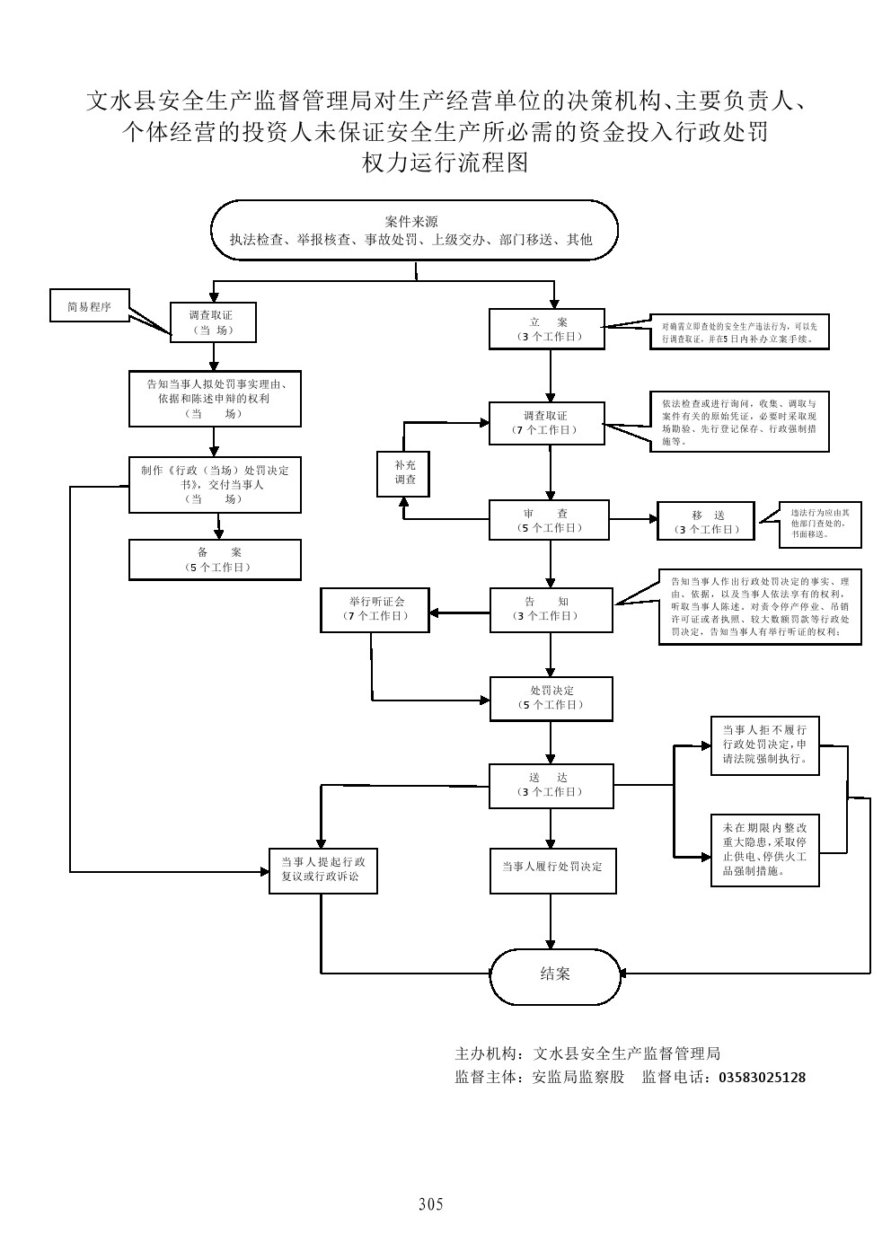 1、立案责任:在检查中或者事故调查过程中发现、或者接到举报、或部门移交的违法案件,予以审查,决定是否立案。 2、调查责任:对已经立案的案件,进行调查时,执法人员不得少于两人,与当事人有直接利害关系的应当回避。调查时应出示执法证件,收集相关证据,允许当事人辩解陈述,执法人员应保守有关秘密。 3、审查责任:对案件违法事实、证据、调查取证程序、法律适用、处罚种类和幅度、当事人陈述和申辩理由等方面进行审查,提出处理意见。 4、告知责任:在做出行政处罚决定前,制作《行政处罚告知书》,符合听证条件的制作《听证告知书》,通知当事人,当事人享有的陈述、申辩、要求听证的权利。 5、决定责任:根据审理情况决定是否予以行政处罚。依法需要给予行政处罚的,制作《行政处罚决定书》,载明违法事实和证据、处罚依据和内容、缴纳罚款的银行、申请行政复议或提起行政诉讼的途径和期限等内容。 6、送达责任:《行政处罚决定书》按照法定的方式和期限送达当事人。 7、执行责任:监督当事人在决定的期限内,履行生效的处罚决定。当事人在法定期限内不申请行政复议或者提起行政诉讼,又不履行的,发出催缴通知,加收罚款滞纳金,再不履行的向人民法院申请强制执行。 |