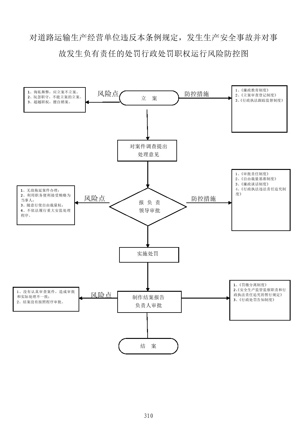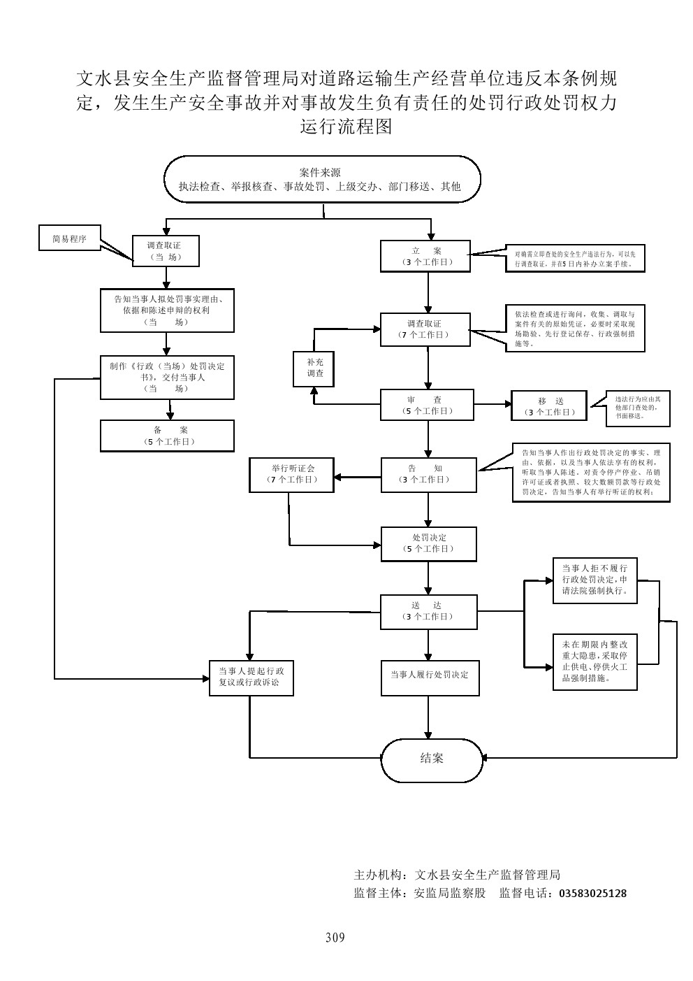 1、立案责任:在检查中或者事故调查过程中发现、或者接到举报、或部门移交的违法案件,予以审查,决定是否立案。 2、调查责任:对已经立案的案件,进行调查时,执法人员不得少于两人,与当事人有直接利害关系的应当回避。调查时应出示执法证件,收集相关证据,允许当事人辩解陈述,执法人员应保守有关秘密。 3、审查责任:对案件违法事实、证据、调查取证程序、法律适用、处罚种类和幅度、当事人陈述和申辩理由等方面进行审查,提出处理意见。 4、告知责任:在做出行政处罚决定前,制作《行政处罚告知书》,符合听证条件的制作《听证告知书》,通知当事人,当事人享有的陈述、申辩、要求听证的权利。 5、决定责任:根据审理情况决定是否予以行政处罚。依法需要给予行政处罚的,制作《行政处罚决定书》,载明违法事实和证据、处罚依据和内容、缴纳罚款的银行、申请行政复议或提起行政诉讼的途径和期限等内容。 6、送达责任:《行政处罚决定书》按照法定的方式和期限送达当事人。 7、执行责任:监督当事人在决定的期限内,履行生效的处罚决定。当事人在法定期限内不申请行政复议或者提起行政诉讼,又不履行的,发出催缴通知,加收罚款滞纳金,再不履行的向人民法院申请强制执行。 |
