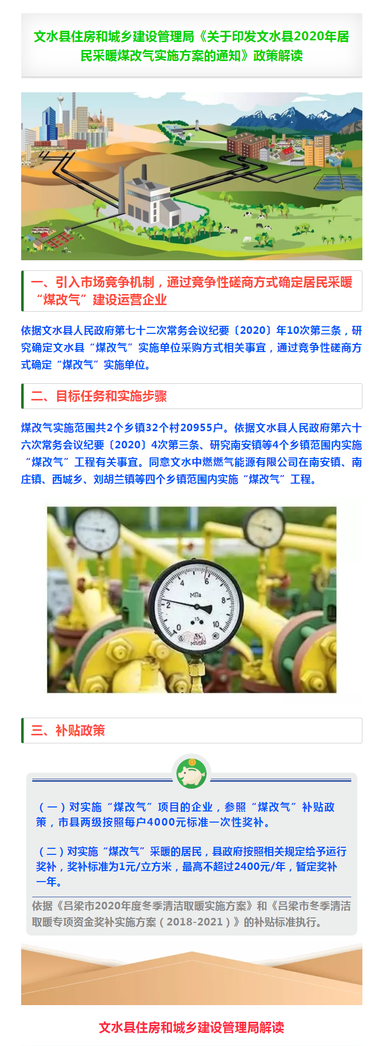 为认真贯彻落实《山西省打赢蓝天保卫战2020年决战计划》,确保完成《吕梁市打赢蓝天保卫战三年行动计划》各项重点任务目标,加快替代居民家用燃煤小锅炉,调整城乡用能结构,有效改善空气环境质量,结合我县实际情况,制定文水县2020年居民采暖煤改气实施方案的通知。