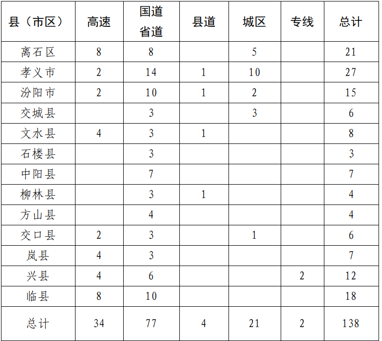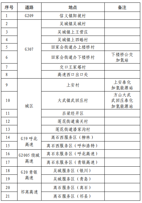 离石区综合能源站布局21个,其中,高速8个,国道上8个(G209上1个,G307上7个),城区5个。