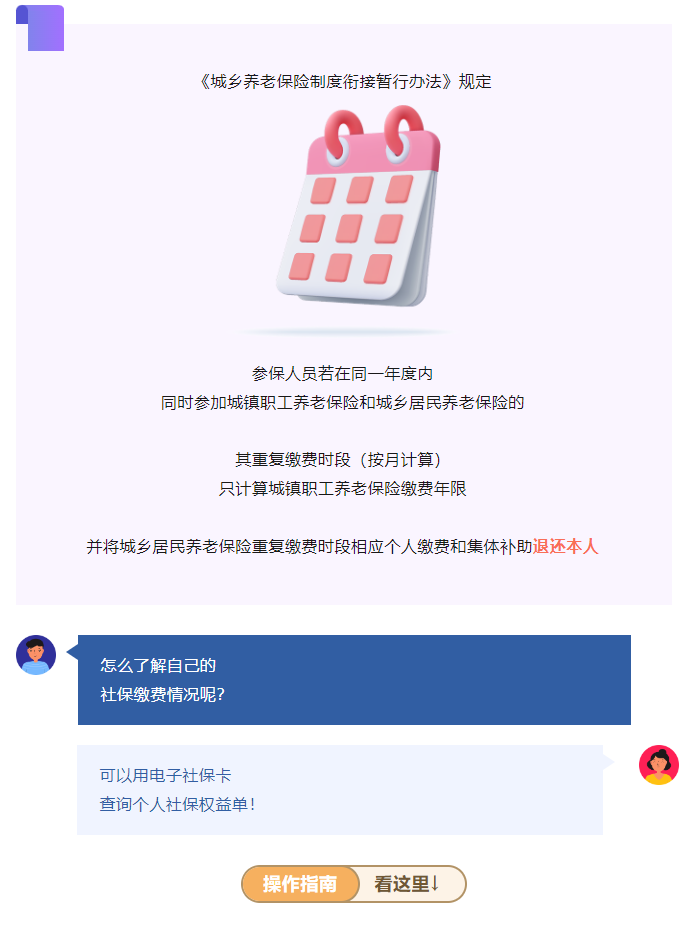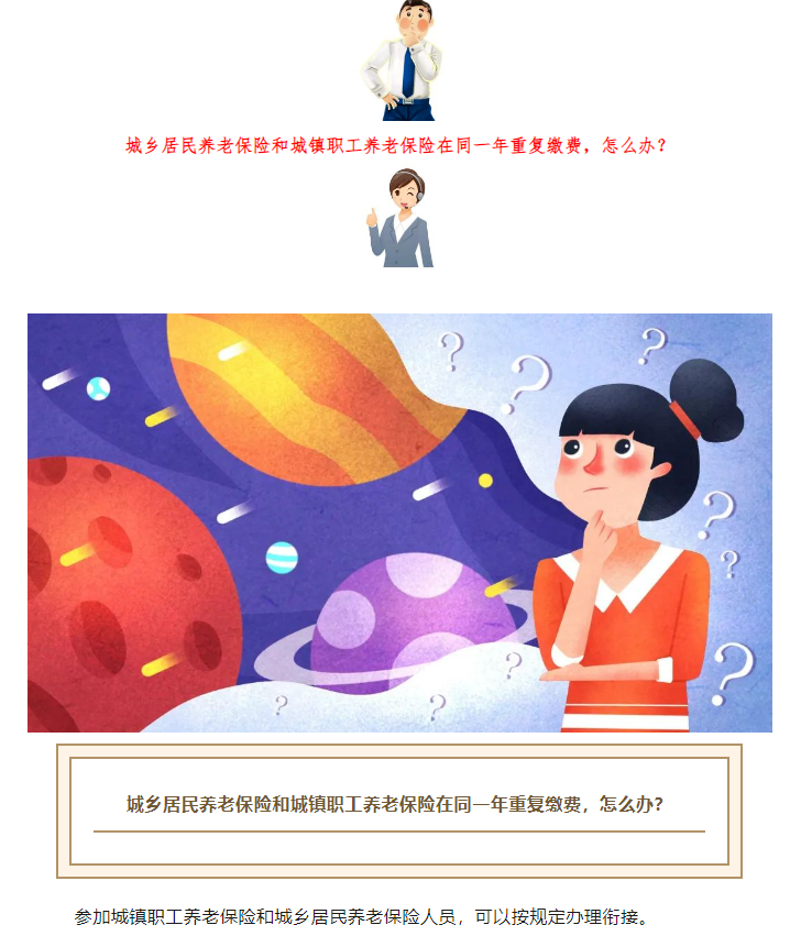养老保险政策解读(九十五)城乡居民养老保险和城镇职工养老保险在同一年重复缴费,怎么办? 来源:吕梁人社 更新时间:2024-04-02 10:36:44